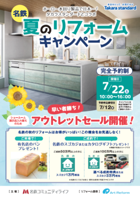 名鉄コミュニティライフでは、ご好評をいただいております「夏のリフォームキャンペーン」ご相談会を、7月22日(土)にタカラスタンダード 新宿ショールームにおいて開催させていただきます。