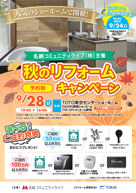 名鉄コミュニティライフでは、ご好評をいただいております「秋のリフォームキャンペーン」を、9月28日(日)に、TDYコラボレーションショールーム(JR新宿駅南口徒歩5分)において開催させていただきます。