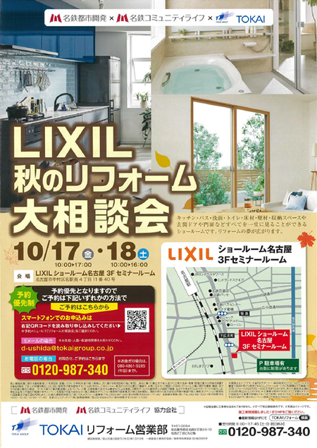 名鉄コミュニティライフでは、名鉄都市開発株式会社、株式会社TOKAIとの共同で、毎回ご好評をいただいております「秋のリフォーム大相談会」を、10月17日(金)、18日(土) の2日間、LIXILショールーム名古屋(3Fセミナールーム) において開催させていただきます。