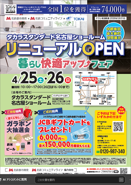 名鉄コミュニティライフでは、名鉄都市開発株式会社、株式会社TOKAIとの共同で、毎回ご好評をいただいております「リフォームフェア」を、4月25日(土)、26日(日) の2日間、タカラスタンダード名古屋ショールームにおいて開催させていただきます。